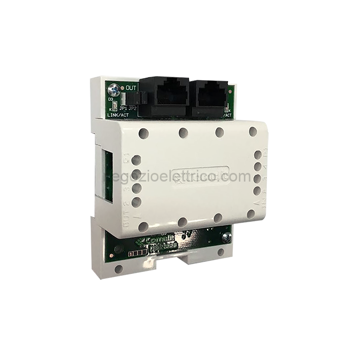 Modulo ripetitore attivo di segnale di montante del sistema ViP 10/100Mbit/s. Non necessita di alimentazione locale. È possibile collegare fino ad 8 dispositivi in cascata. Prevede due connettori RJ45 (PSE/PD) NON in standard IEEE802.3at/af. Dimensioni: 60x85x35mm (4 moduli DIN).