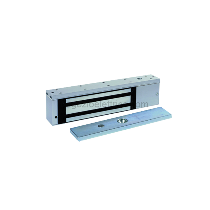 Elettroserratura da parete, alimentazione 12/24VDC, ritenuta 300 Kg. Dimensioni (LxHxP): 250x47x25mm.