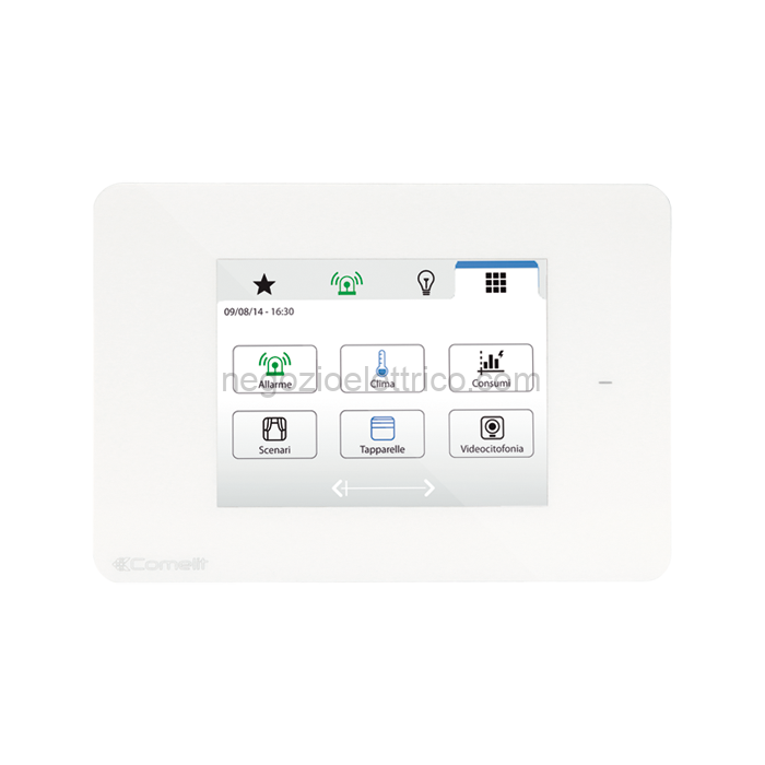 Mini Touch 3,5″ con funzione supervisore. Da collegare al BUS SimpleHome per la gestione dell’impianto di automazione per il controllo di luci, carichi, tapparelle, clima, scenari, irrigazione, consumi e al sistema SimpleSafe per la visualizzazione e il comando dell’impianto di antintrusione. Sonda di temperatura integrata, 1 uscita a relé in scambio, 3 uscite a transistor per il comando delle 3 velocità di un fan-coil. Lettore RFID integrato per attivazione scenari da transponder (ad es. art.SK9050G/A). Retroilluminazione variabile in base allo stato delle zone clima dell’impianto, in base allo stato dell’impianto di antintrusione o con funzione segnapasso con colorazione regolabile. Installabile su scatola standard 3 moduli per serie civile. Dimensioni 125x85mm. Sporgenza da parete 10mm. Assorbimento massimo 2W. Colore bianco.