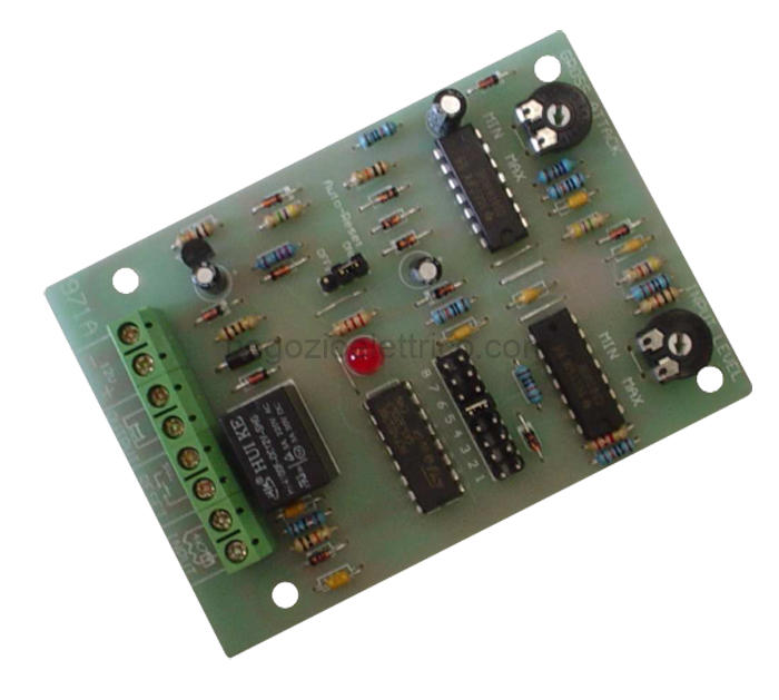 Scheda contaimpulsi per ingressi veloci. Alimentazione 10-15 VDC, assorbimento 45 mA, contatto NC, regolazione impulsi da 1a 8, velocità e sensibilità. Dimensioni: 65×90 mm.