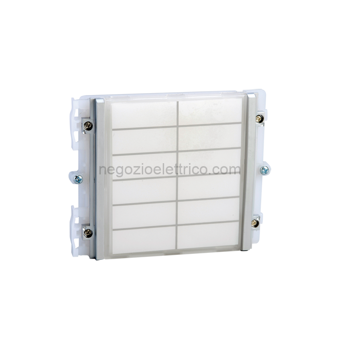 Modulo retroilluminato a led per segnalazioni varie. Illuminazione cartellino selezionabile tra blu/bianco/spento. Contiene cartoncino per la scrittura dei nomi e dei codici degli utenti max 12.Dimensioni 112×89,5×39.
