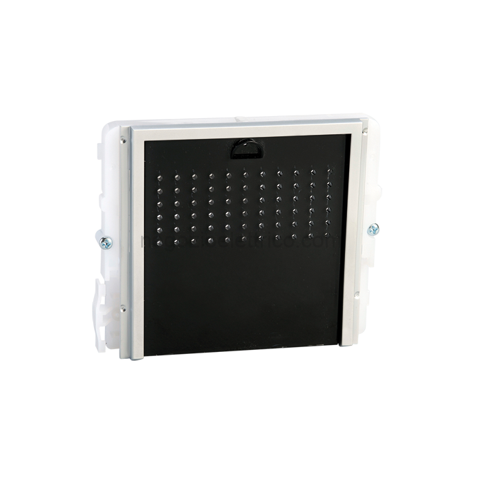 Modulo predisposto per portiere audio, con mascherina serigrafata nera. Da completare con il relativo portiere citofonico che dipende dal sistema di cablaggio utilizzato. Dimensioni 112×89,5×32 mm.