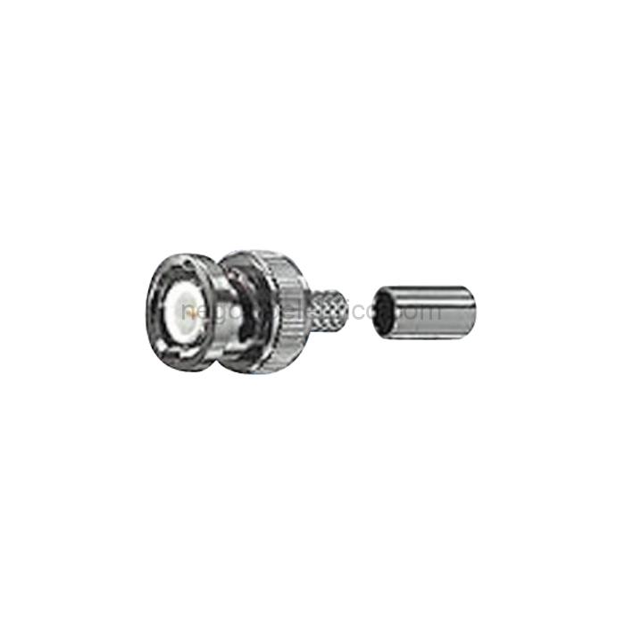 Connettore tipo BNC da crimpare, corpo in ottone nichelato ed isolamento in teflon, adatto per cavi RG174 e art.43754 (confezione da 50 pezzi).