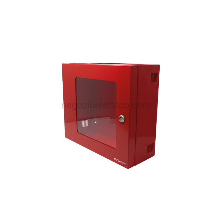 Armadio a muro che consente il montaggio a parete delle postazioni di emergenza Art. 49BME001, 49BME012 e 49BME216, dotato di portella frontale con finestra traparente. Colore rosso. Dimensioni del box (LxHxP mm) 370 x 320 x 137,8