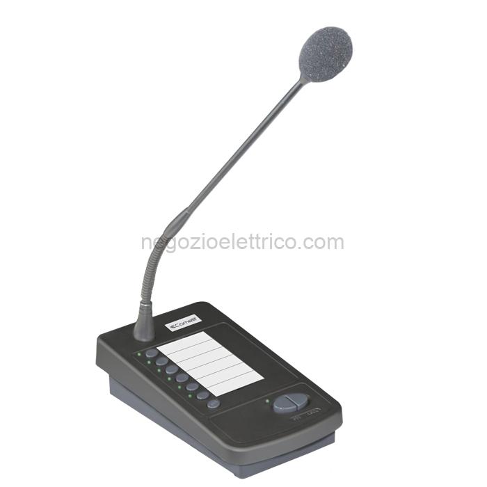 Postazione preamplificata con unità elettrete con microfono a stelo flessibile. 6 tasti per la selezione zone (configurabili singolarmente anche come tasti allarme) e chiamata generale, tasti a rilascio/a ritenuta PTT+LOCK. Configurazione del livello di priorità (fino a 7) e regolazione della sensibilità del microfono. Spia di accensione e di segnalazione di occupato. Connettori RJ45 per collegamento con cavi CAT5e SF-UTP diretti.