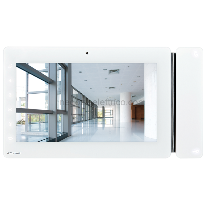 Monitor Maxi a colori da incasso (utilizzando la scatola opzionale art. 6817) o a parete (con supporto opzionale art. 6820) con schermo da 7″ / 16:9, fonica vivavoce full-duplex e comandi touch sensitive. Consente la regolazione del livello di luminosità, contrasto, volume fonica e volume suoneria. È possibile la personalizzazione della suoneria scegliendo fra diverse melodie. Dotato di serie di pulsante apriporta, pulsante di abilitazione/disabilitazione fonica con relativi led di segnalazione e di altri 6 pulsanti per autoaccensione, servizio privacy e altre funzioni programmabili. Gestisce di serie la chiamata fuori porta e la ripetizione di chiamata ed è completo di 2 dip-switch a 8 posizioni per la programmazione del codice utente e la programmazione dei pulsanti. Dotato di morsetto di derivazione da montante art. 1214/2C. Il monitor è utilizzabile su impianti digitali a 2 fili Simplebus2. Dimensioni (L x H x P): 223x124x25 mm.