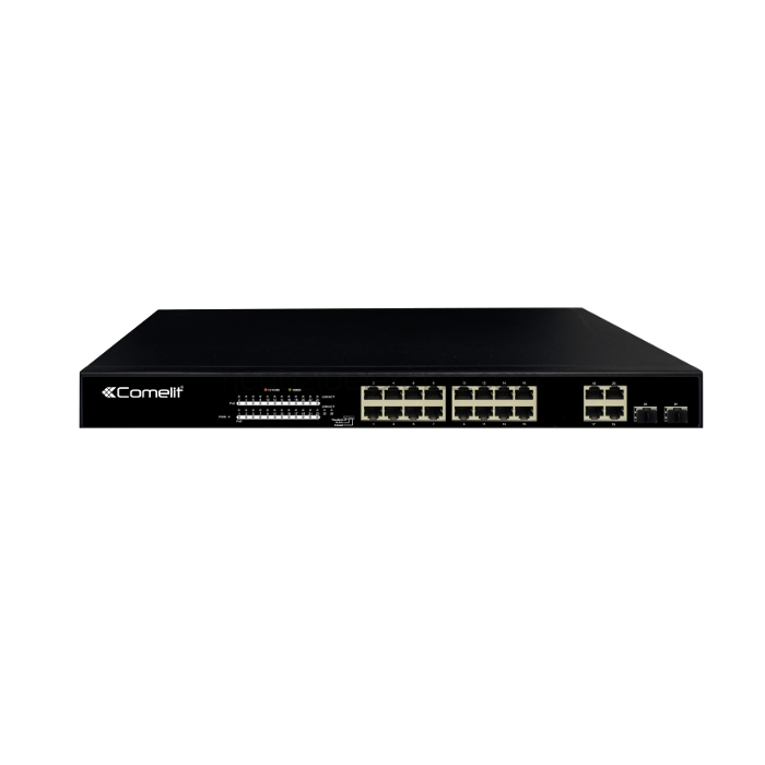 Switch di rete a 16 porte PoE + 4 uplink + 2 slot SFP, gigabit.