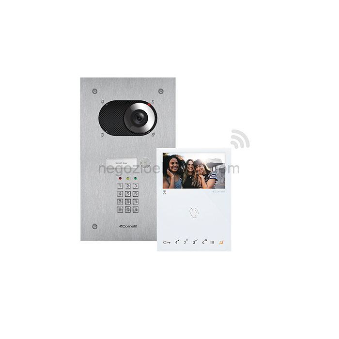 Kit monofamigliare con pulsantiera Switch da incasso a 1 pulsante e tastiera chiave elettronica e monitor Mini handsfree con Wi-Fi che permette di rispondere alla chiamata videocitofonica ovunque. Già configurato e pronto all’uso. Espandile fino a massimo 4 posti interni. Sistema Simplebus2.