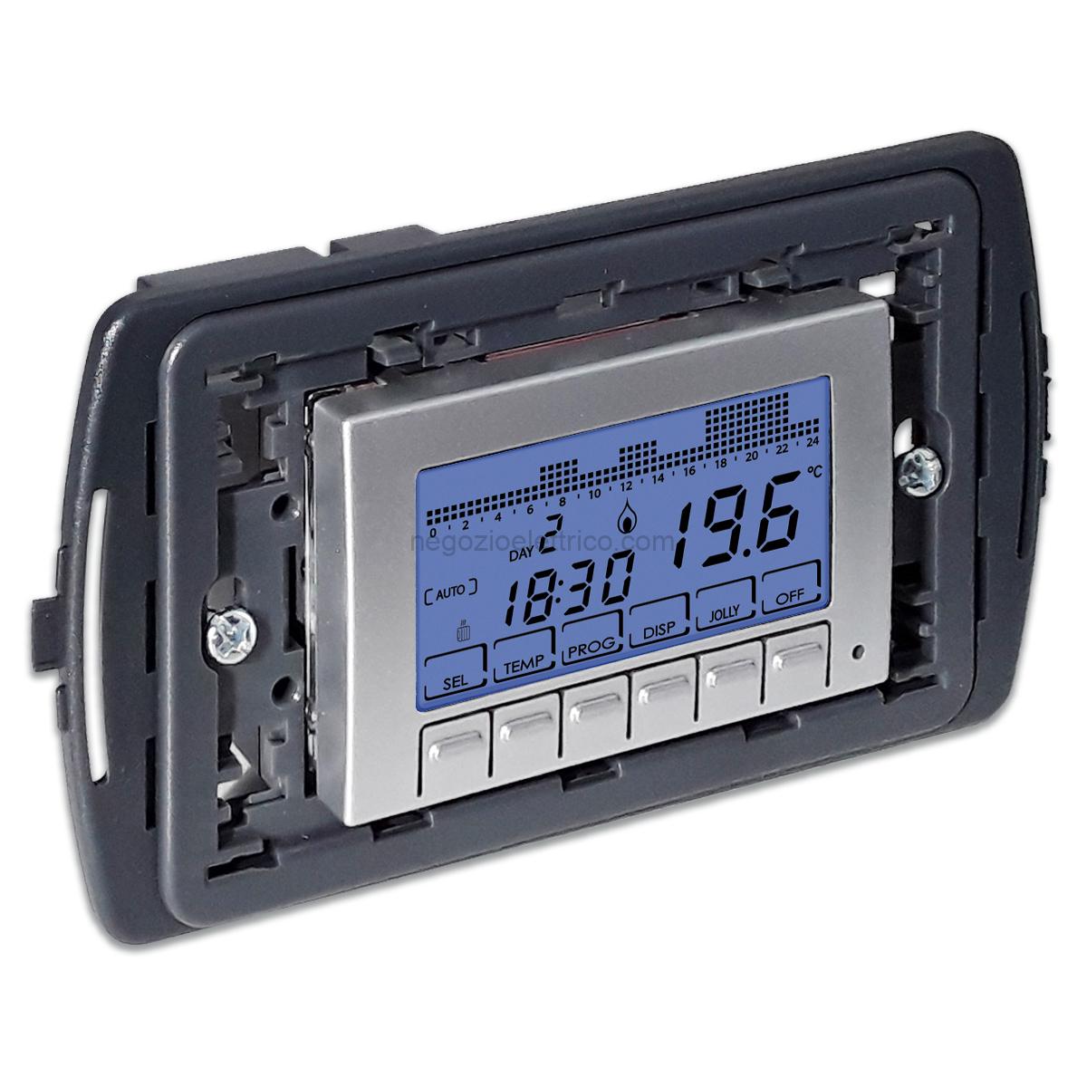 Cronotermostato elettronico da incasso con programmazione settimanale, funzionamento con 2 pile a stilo alcaline AAA 1,5V, MODO STEEL