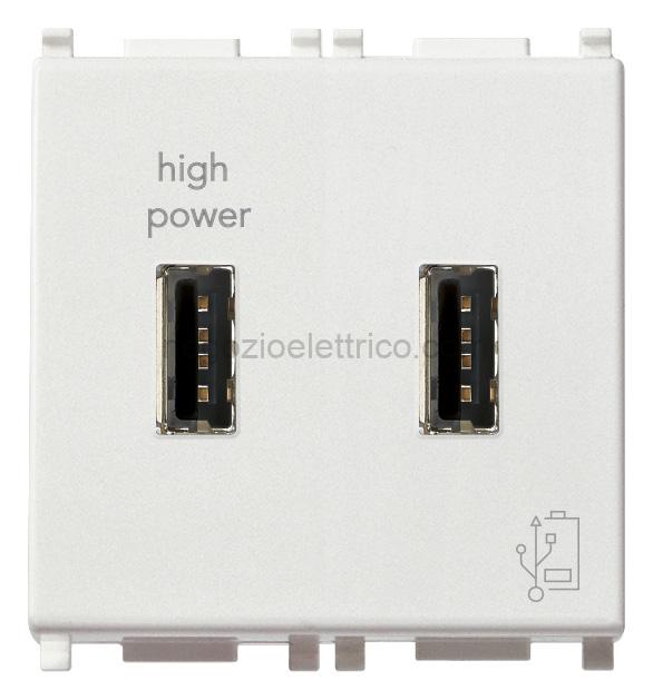 Unità di alimentazione 5 V 2,1 A per dispositivi elettronici, 2 uscite USB frontali che erogano complessivamente 2,1 A ottimizzate per caricare un dispositivo di 2,1 A (es. tablet) o contemporaneamente due dispositivi da 1 A (es. smartphone e phablet), alimentazione 120-230 V~ 50/60 Hz, bianco – 2 moduli