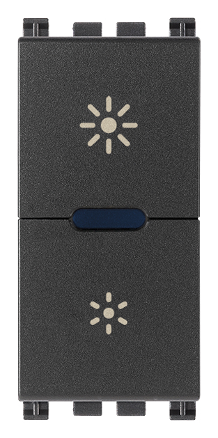 Dimmer universale 230 V~ 50 Hz a taglio di fase, per lampade ad incandescenza 40-400 W, trasformatori elettronici 40-300 VA, lampade CFL 10-200 W, lampade LED 3-200 W, per alimentatori elettronici LED a taglio di fase, comando ON/OFF e regolazione con pulsanti incorporati o da più punti con pulsanti NO, funzione MASTER per 19137, regolazione intensità luminosa minima, individuazione al buio, grigio. Apparecchio non installabile nei contenitori Isoset