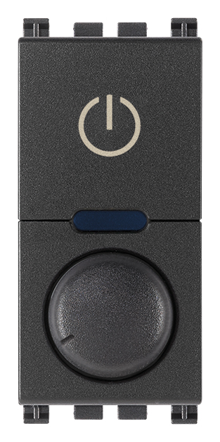 Dimmer universale 230 V~ 50 Hz a taglio di fase, per lampade ad incandescenza 40-400 W, trasformatori elettronici 40-300 VA, lampade CFL 10-200 W, lampade LED 3-200 W, per alimentatori elettronici LED a taglio di fase, comando ON/OFF con pulsante incorporato o da più punti con pulsanti NO, regolazione con potenziometro rotativo incorporato, funzione MASTER per 19137, regolazione intensità luminosa minima, individuazione al buio, grigio. Apparecchio non installabile nei contenitori Isoset