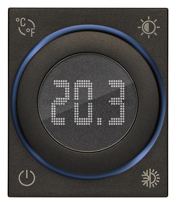 Termostato a rotella con uscita a relè 5(2) A 240 V~, riscaldamento e condizionamento in modalità ON/OFF, dispositivo di controllo della temperatura di classe I (contributo 1%), retroilluminazione a LED bianca con regolazione di intensità , alimentazione 100-240 V 50/60 Hz, da completare con placca, nero – 2 moduli