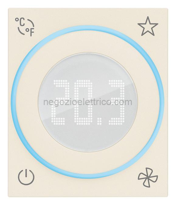 Termostato per domotica a rotella per controllo della temperatura ambiente (riscaldamento e condizionamento), gestione impianti a 2 e 4 tubi, comando fan-coil a 3 velocità e proporzionale, dispositivo di controllo della temperatura di classe I (contributo 1%) in modalità ON/OFF, di classe IV (contributo 2%) in modalità PID, interfacciabile con attuatore con uscite analogiche proporzionali 01466.1 per realizzare un termostato d’ambiente modulante di classe V (contributo 3%), 1 ingresso per sensore di temperatura filare 02965.1, retroilluminazione a led bianca, canapa – 2 moduli