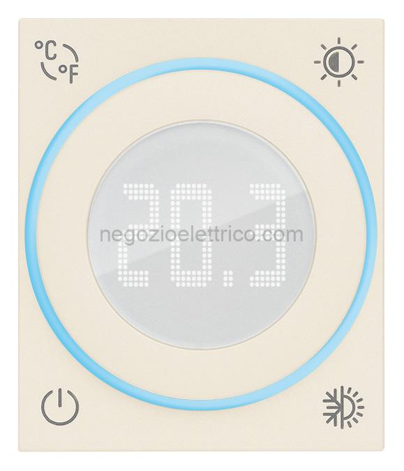 Termostato a rotella con uscita a relè 5(2) A 240 V~, tecnologia IoT su standard Bluetooth technology 5.0 per realizzazione sistema mesh VIEW Wireless, 1 ingresso per sensore di temperatura esterna, alimentazione 100-240 V~ 50/60 Hz, riscaldamento e condizionamento in modalità ON/OFF e PID, dispositivo di controllo della temperatura di classe I (contributo 1%) in modalità ON/OFF, di classe IV (contributo 2%) in modalità PID, retroilluminazione a LED bianca con regolazione di intensità, canapa – 2 moduli
