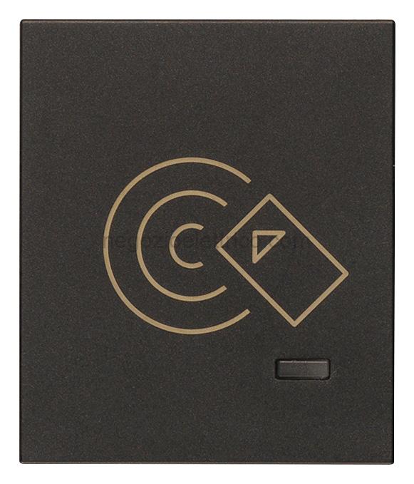 Lettore fuoriporta di smart card NFC/RFID, configurazione card mediante App VIEW Wireless standard Bluetooth technology, tecnologia IoT su standard Bluetooth technology 5.0 per realizzazione sistema mesh VIEW Wireless, 1 uscita a relè NO 16 A 100-240 V~, 1 ingresso DND, LED con regolazione di intensità, alimentazione 100-240 V~ 50/60 Hz, nero – 2 moduli